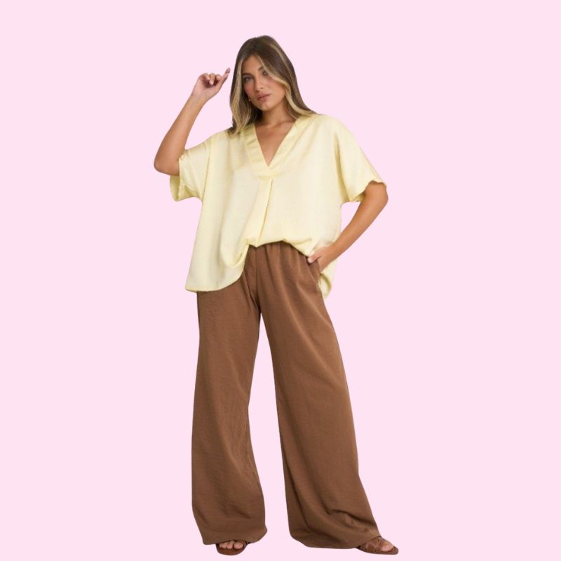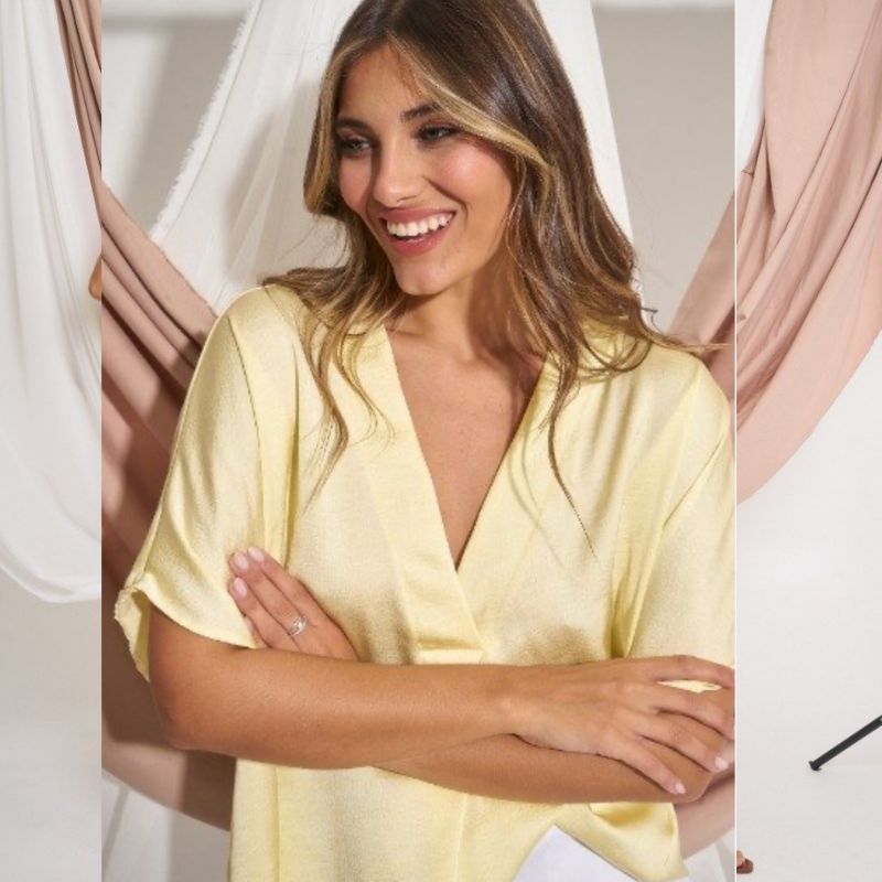 Tela liviana, con caída natural y brillo sutil. Color: amarillo manteca.