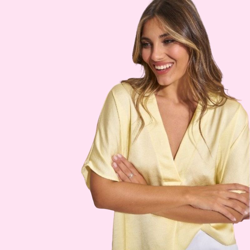 Blusa de satén rústico. Corte cruzado con escote en “V” y mangas cortas amplias.