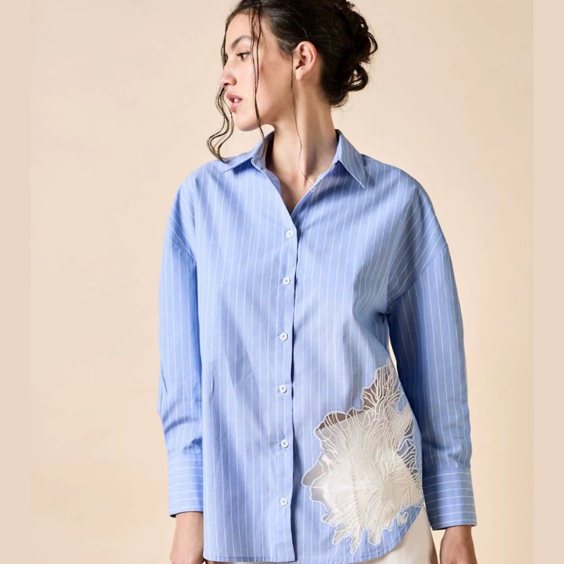 Camisa de corte clásico, confeccionada en poplín celeste con finas rayas verticales blancas y Flor calada