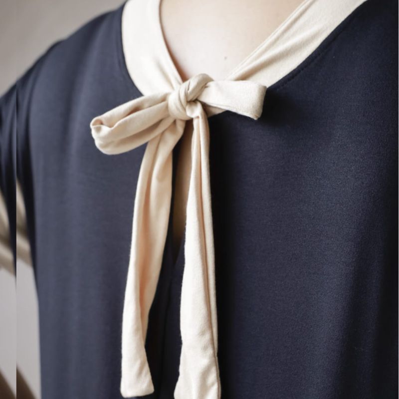 •Mangas cortas amplias con vuelta en puño contrastante.