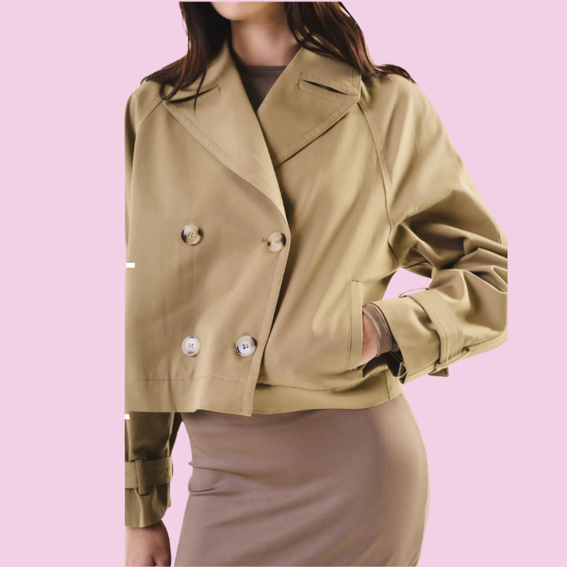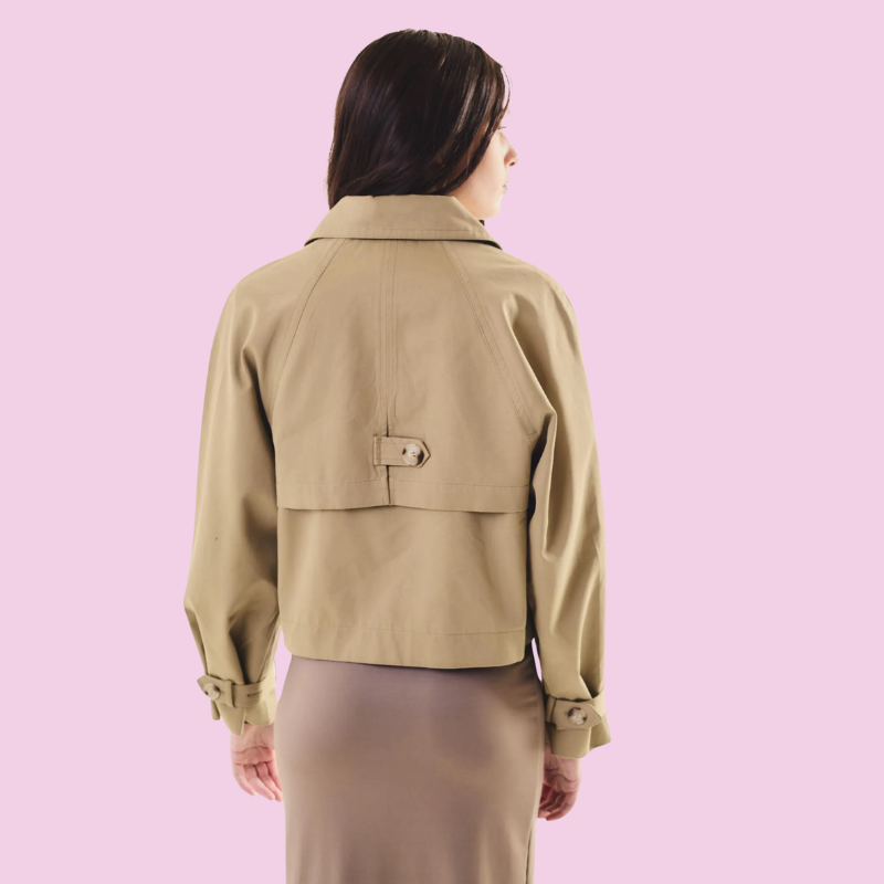 Clásico renovado con diseño moderno. Trench corto confeccionado en tela impermeable, con doble abotonadura, bolsillos laterales y puños regulables. Ideal para los días de lluvia o media estación, sin perder estilo.